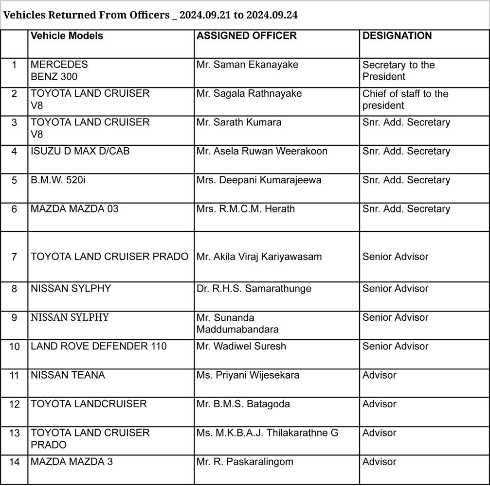 The statement further indicated that arrangements are underway to allocate these vehicles to essential services promptly in accordance with the directives of President Anura Kumara Dissanayake.